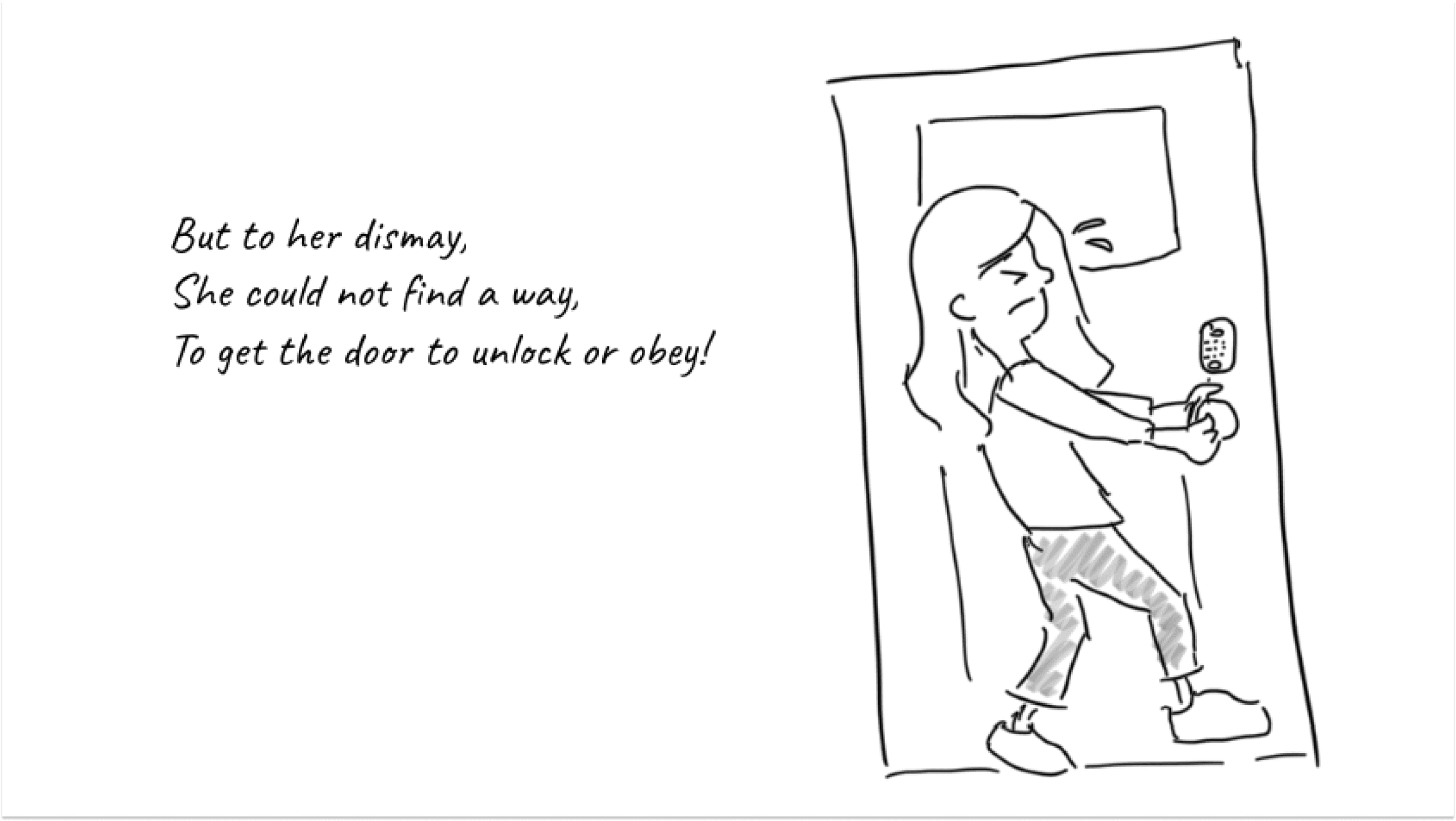 A major defect for self-tours is when customers are unable to get inside for a variety of reasons. I storyboarded the negative experience when customers can’t get in (and luckily it rhymes).